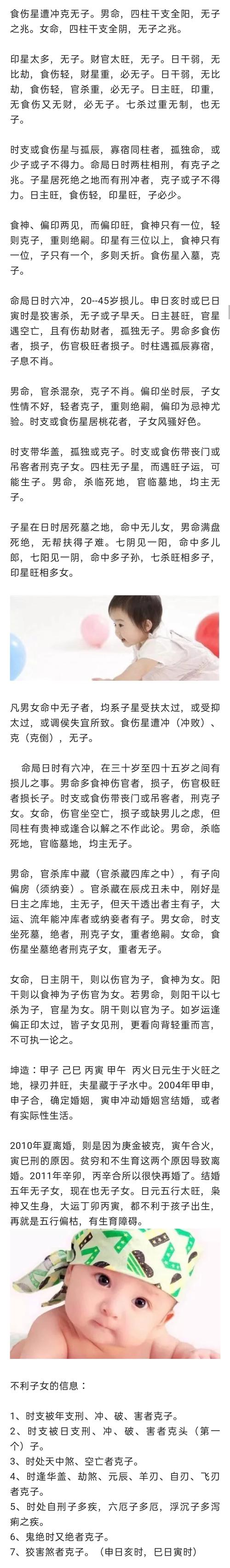 若一个八字中既没有代表子女的“食神”“伤官”,也缺乏象征管控能力的“正官”“七杀”,便如同生命之树缺少了结果实的枝桠,比如日主极弱却无生扶之气,或全局五行严重失衡导致相关十神被完全压制,都可能形成这种极端情况,此时就像土壤贫瘠无法育苗,自然难有子嗣扎根生长。