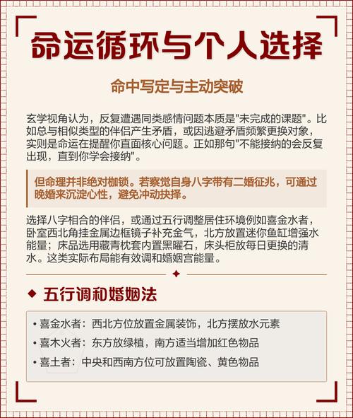 很多人在八字命理中被断出“二婚命”,心里难免犯嘀咕:难道真的逃不过两次婚姻的结局吗?其实啊,命理显示的是倾向性而非绝对定论,就像天气预报说有雨,我们也能打伞穿靴改变处境,今天就聊聊如何用实际行动化解这个说法。