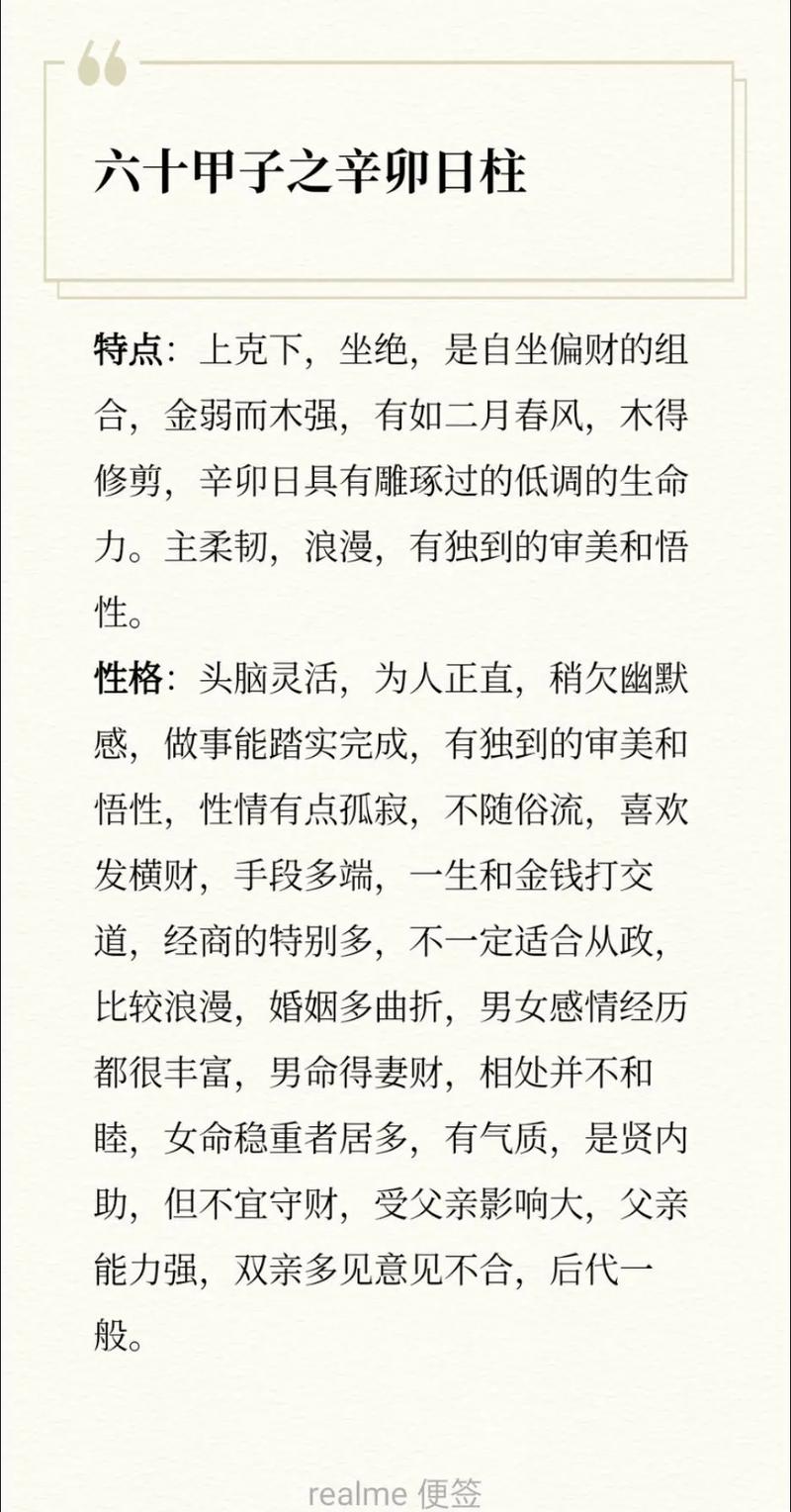 当辛金遇上卯木,形成了独特的气场,早年或许经历些波折,但随着阅历增长,能把自身的优势发挥到极致,事业上适合循序渐进地发展,不宜急功近利;感情方面则要大胆表达心意,别让犹豫错失良缘。