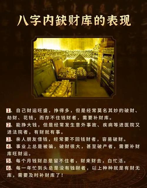 得明确“财库”并非财富的唯一标准,八字中财星(如正财、偏财)的强弱、位置以及与其他干支的关系,对财运的影响可能比财库更直接,比如一个人八字中财星旺盛且透出天干,即便没有财库,也可能通过自身努力或机遇获得不错的收入;相反,若财星微弱又被克制,即使有财库,也可能出现“库中有财却难取”的情况——就像仓库里堆满了粮食,但门锁坏了进不去,或是进去了也搬不出来,不能单纯以“有没有财库”来判断一个人的财运好坏。