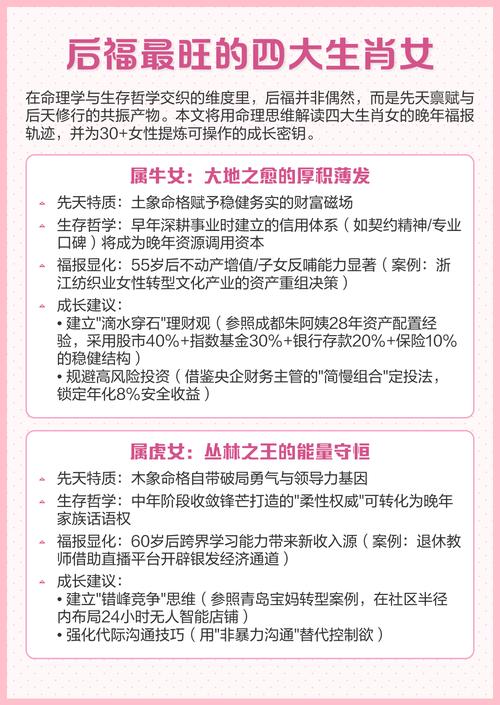 每个生肖都有其独特的性格特点和优势,而这些特点往往决定了一个人的命运走向,当然,除了生肖之外,个人的努力和选择也是至关重要的,希望每一位女性都能在自己的后半生中找到属于自己的幸福和福报。