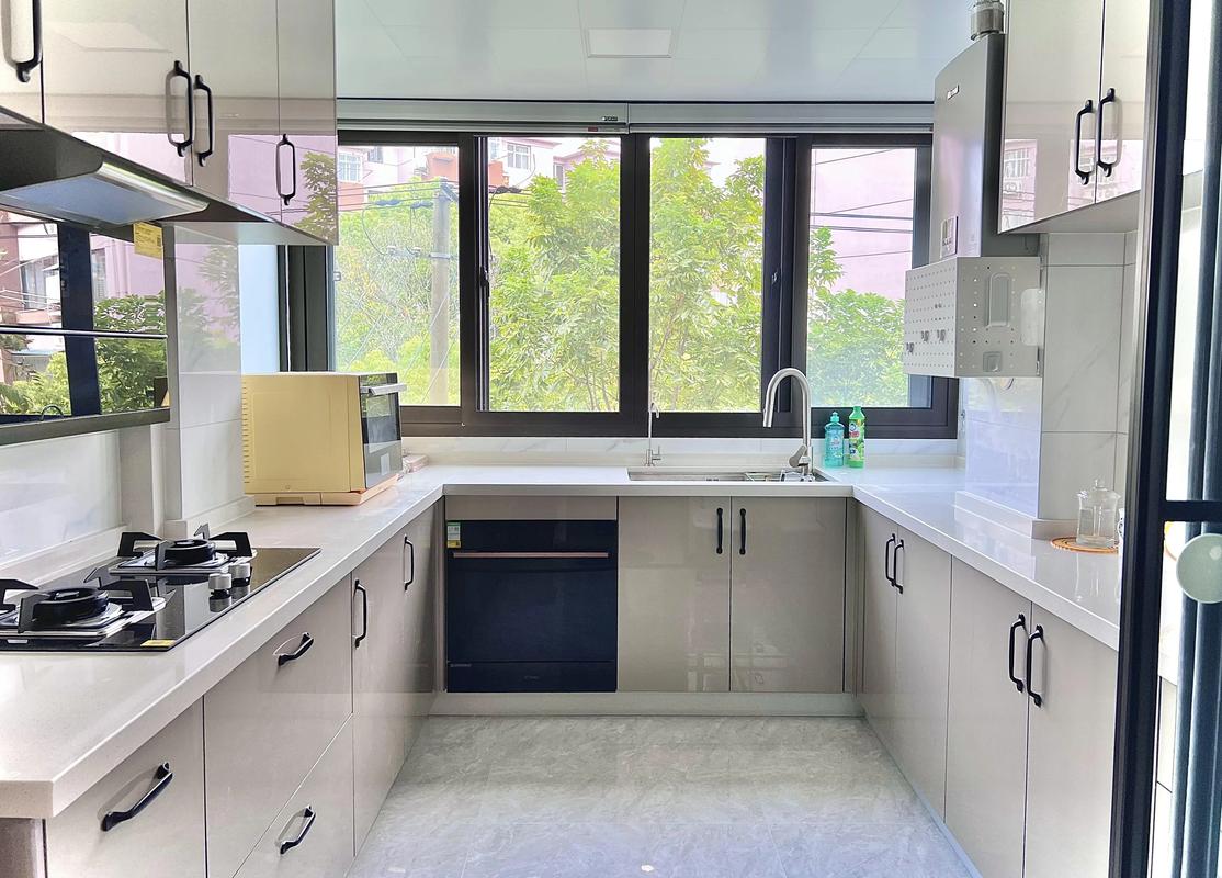 有人觉得大窗户更敞亮,但过度通透反而不利藏风纳气;也有人因担心漏财而只留小缝,结果导致湿浊之气堆积,正确的做法是根据厨房面积调整比例:单面采光的厨房可选1.2-1.5米宽的推拉窗,足够满足日常需求又不显压抑;若是L型或U型操作台区域,局部加设高侧窗既能补充光线又不会直吹炉灶,记住原则:明亮但不过分暴露,透气却不形成穿堂风。