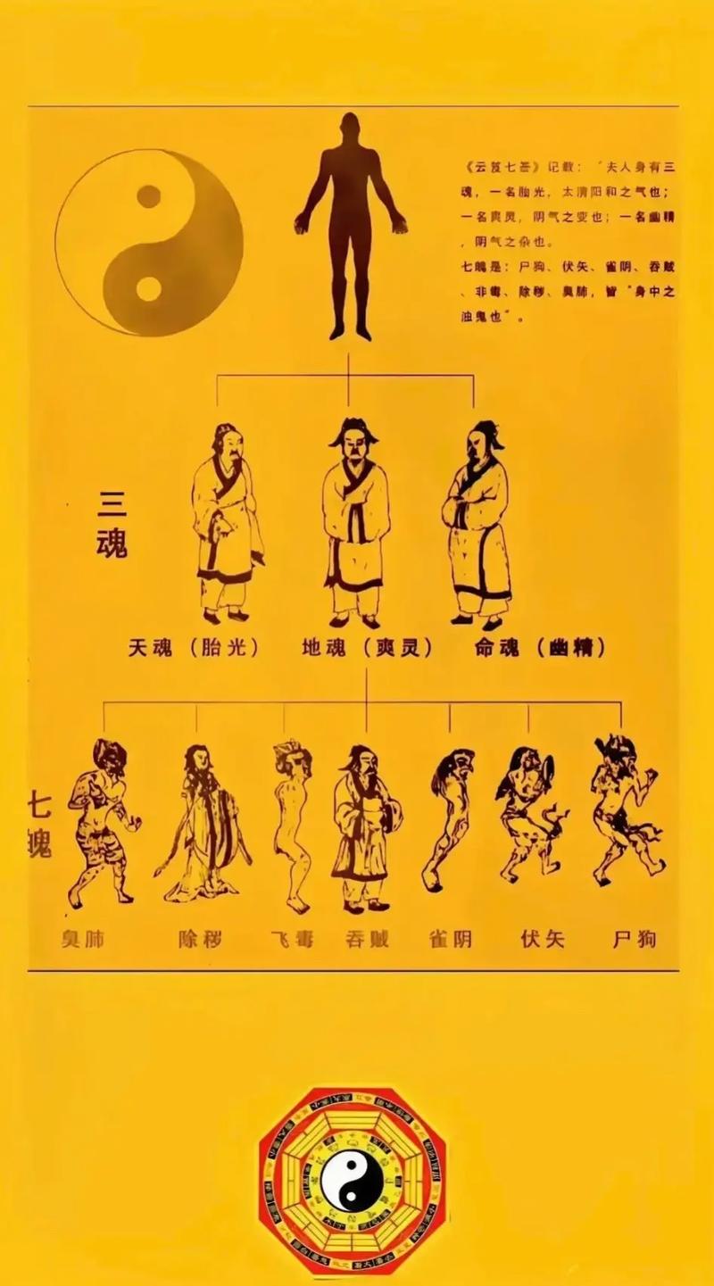 在道教观念中,三魂七魄是构成人体精神世界的基本元素,三魂通常指“胎光”、“爽灵”和“幽精”,分别代表了生命之光、智慧之源以及情感纽带;七魄则与人的身体机能密切相关,如呼吸、消化等生理活动,这些魂魄的状态直接影响到一个人的精神面貌及身体健康状况。