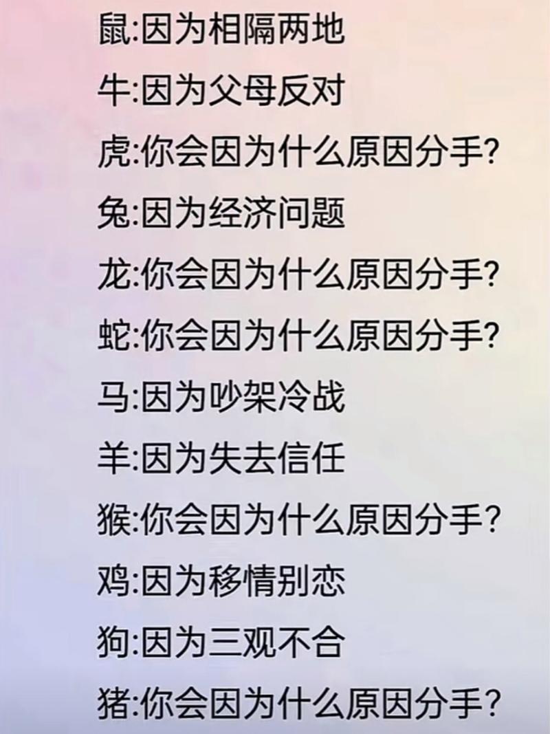 说到底,每个生肖的分手都不是一时冲动,而是内心需求长期未被满足的结果,与其纠结星座运势,不如多关注眼前人——毕竟,再好的生肖配对,也抵不过真心实意的经营。