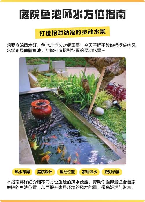 位置的重要性:在风水学中,鱼池的位置至关重要,鱼池应该设置在庭院的偏东或东南方向,这两个方位被认为是“财位”,有利于聚集财富和正能量,如果条件允许的话,最好能够确保阳光充足,这样不仅有利于鱼类生长,也能使整个庭院充满生机。