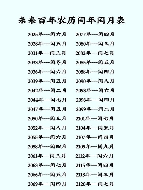 我们需要了解闰月的基本概念,闰月是阴阳历在闰年中增设的一个月份,主要用于协调农历年与回归年之间的天数差异,防止农历月序与四季脱节,中国农历采用“十九年七闰”法,即在19个农历年中设置7个闰年,每个闰年包含13个月,闰月的确定依据二十四节气中的“中气”分布:若某农历月份不含中气,则该月为前一个月的闰月,称“闰某月”。