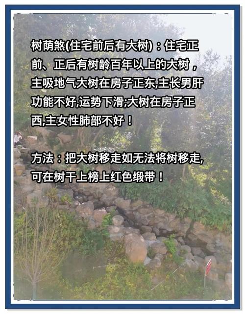 我们来聊聊大树,在风水学中,大树被视为一种“阳”的象征,能够带来生机和活力,一棵枝繁叶茂的大树,不仅美化了环境,还能为周围带来清新的空气和舒适的阴凉,如果大树的位置不当,比如正对着门窗,就可能形成所谓的“煞气”,影响家中的气场平衡,选择和布局大树时,要考虑其对住宅的具体影响,确保既能享受大自然的馈赠,又不破坏家居的和谐。